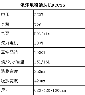 FCC35泡沫地毯清洗機,制泡、滾刷、吸干三合一。快速干燥和一流的清潔性能,確保地毯可立即投入使用。配合C-4地毯高壓抽洗機做徹底清洗,能滿足持續地毯維護的需求,并持久提供美觀清潔的地毯。