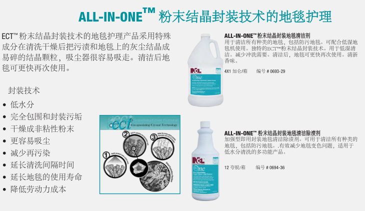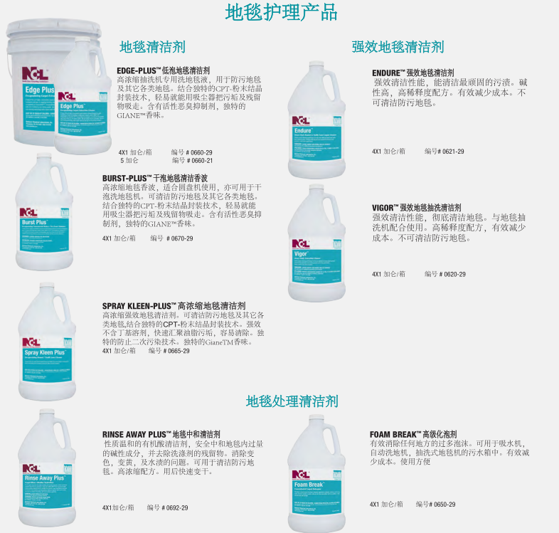 由NCL提供成熟配方產品的地毯護理解決方案,可以延長地毯的使用壽命,維護地毯的靚麗色彩,提供使用者滿意的環境氛圍和舒適度。NCL提供的全方面的地毯護理產品包括清潔劑、除漬劑、地毯防護劑及其它的配套產品,讓使用者在維護地毯時可以輕易的使用產品,并有效控制成本。特別是我們的ECT™和EPT™粉末結晶封裝技術的防再次污染配方的地毯清潔劑將污垢包裹成一個松脆的、不粘的粉末殘渣,通過常規的真空吸塵器很容易去除。使地毯更加美麗干凈。其結果是延長了地毯清洗間隔時間,延長了地毯保持干凈的時間。